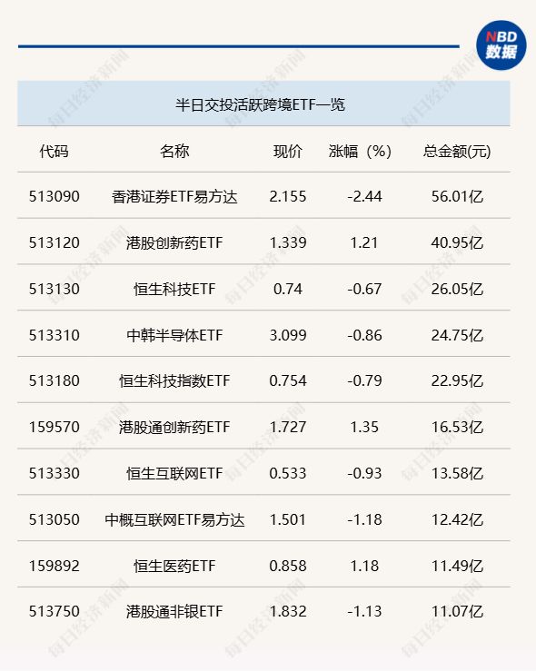 1月8日上午,ETF市場(chǎng)交投持續(xù)保持高活躍度,證券ETF(512880)再度放量,半日成交金額達(dá)到31.42億元,而科創(chuàng)芯片、券商、半導(dǎo)體設(shè)備等相關(guān)ETF半日成交金額也在10億元以上;跨境ETF方面, 香港證券ETF易方達(dá)(513090)半日成交金額依舊在50億元以上,達(dá)到56.01億元。