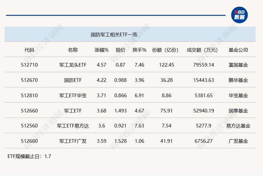 (原標(biāo)題:行業(yè)ETF風(fēng)向標(biāo)丨證券ETF半日成交金額超30億元,軍工龍頭ETF半日漲幅達(dá)4.57%)