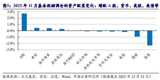收益的背后是基金投顧的積極調(diào)倉(cāng)。同源數(shù)據(jù)顯示,2025年12月共有178只基金投顧組合調(diào)倉(cāng),且主要增配了A股、黃金等資產(chǎn),減配了債券、美股等資產(chǎn)。其中,其對(duì)A股的增配幅度大幅超過(guò)其他資產(chǎn),接近3%,而這已經(jīng)是基金投顧組合連續(xù)兩個(gè)月增配A股資產(chǎn)。