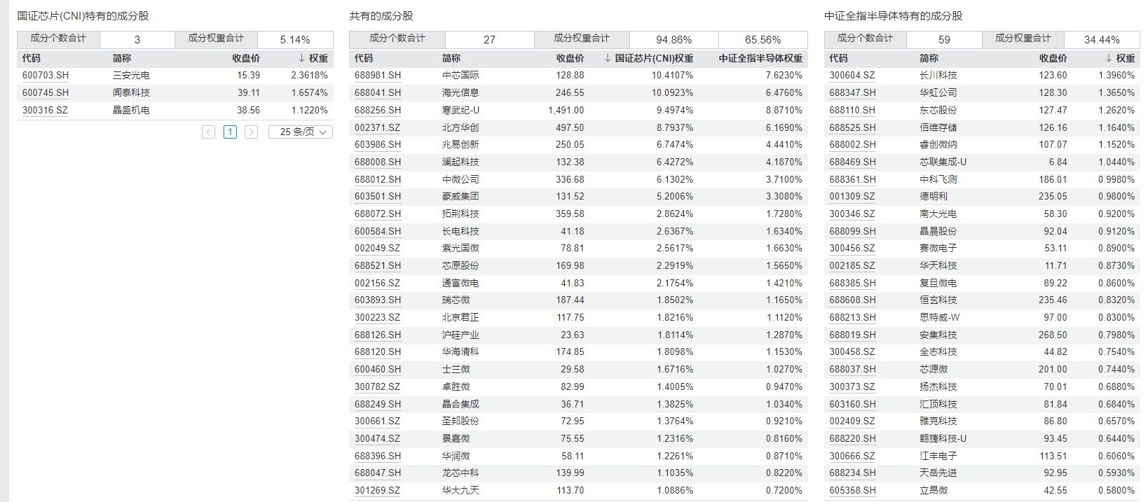 進(jìn)一步對比兩個指數(shù)的成分股,可以發(fā)現(xiàn)兩個指數(shù)重合的成分股是27只,國證半導(dǎo)體芯片指數(shù)獨(dú)有的成分股是3只,包括了三安光電、聞泰科技、晶盛機(jī)電,中證全指半導(dǎo)體產(chǎn)品與設(shè)備指數(shù)獨(dú)有的成分股是59只,主要包括了長川科技、華虹公司、東芯股份等。