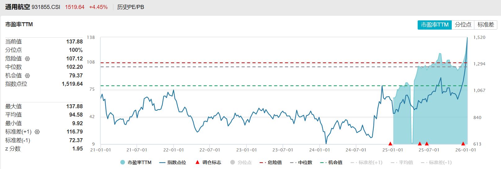 再看兩個指數(shù)目前的估值水平,Wind數(shù)據(jù)顯示,兩個指數(shù)目前的市盈率TTM都處在歷史100%分位的位置,均是歷史高位。不過中證通用航空主題指數(shù)過往的統(tǒng)計(jì)數(shù)據(jù)區(qū)間較短,主要反映的是近一年來的估值水平。