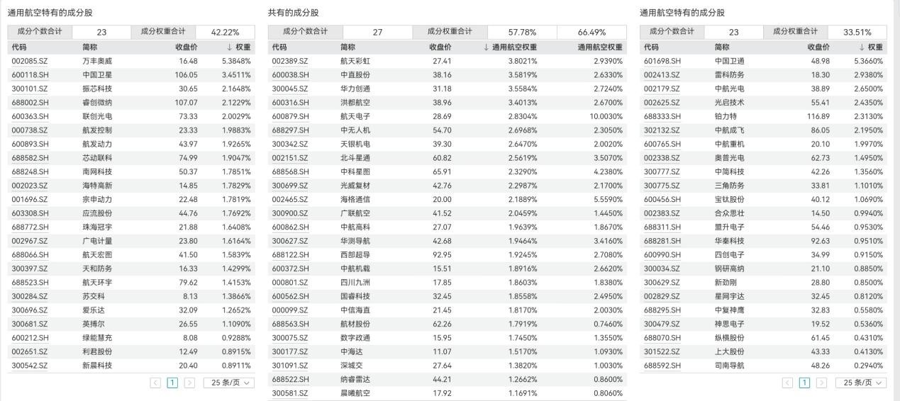進(jìn)一步對比兩個指數(shù)的成分股,可以發(fā)現(xiàn)共有的成分股數(shù)量是27只,各自獨(dú)有的成分股都是23只。其中國證通用航空產(chǎn)業(yè)指數(shù)獨(dú)有的成分股包括了萬豐奧威、中國衛(wèi)星、振芯科技等,中證通用航空主題指數(shù)獨(dú)有的成分股包括了中國衛(wèi)通、雷科防務(wù)、中航光電等。