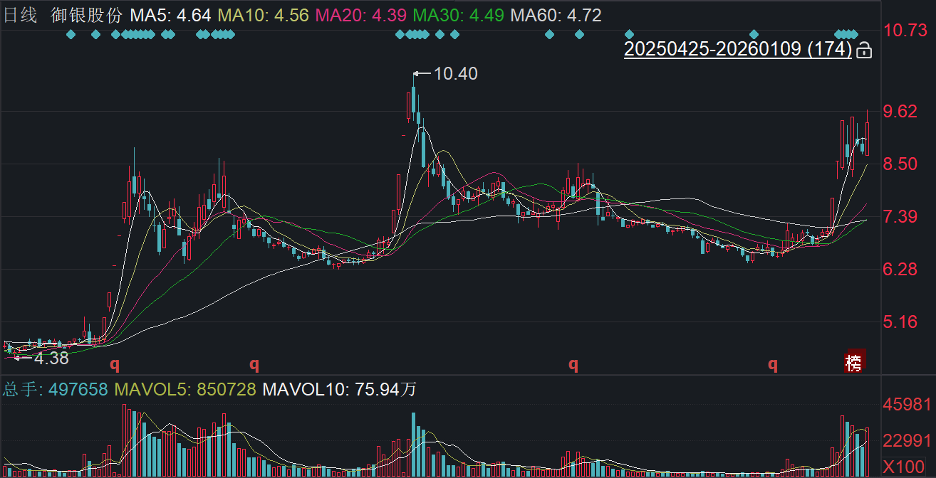 二級(jí)市場(chǎng)上,截至1月9日收盤(pán),御銀股份上漲6.97%報(bào)9.36元/股,總市值約71.25億元,近一年公司股價(jià)累計(jì)上漲約107%。