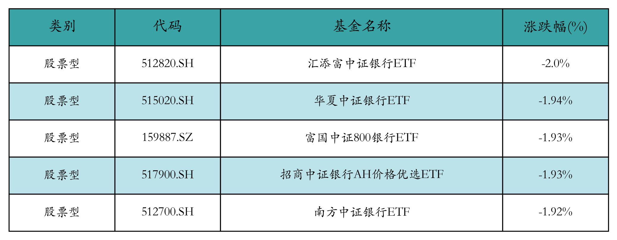 上周股票型ETF跌幅最大的5只ETF及其收益率分別為:匯添富中證銀行ETF(-2.0%)、華夏中證銀行ETF(-1.94%)、富國中證800銀行ETF(-1.93%)、招商中證銀行AH價格優(yōu)選ETF(-1.93%)、南方中證銀行ETF(-1.92%)。詳情見下表:
