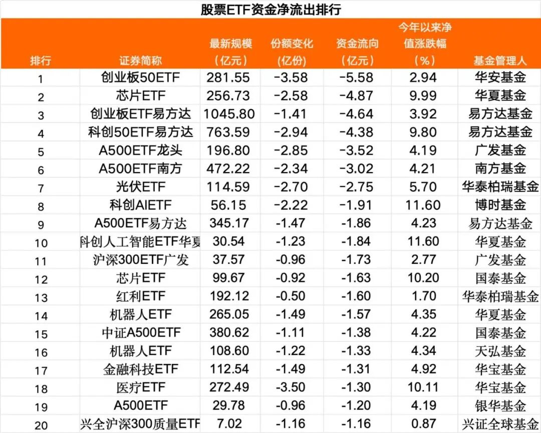 此外,股票ETF中,當(dāng)日24只股票ETF凈流出超過(guò)1億元,創(chuàng)業(yè)板、科創(chuàng)50、中證A500等寬基ETF,以及芯片、光伏、人工智能等行業(yè)主題ETF是資金凈流出較多的品種。