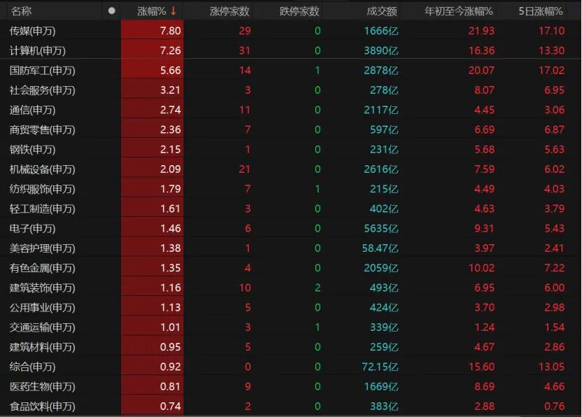 除了石油石化、煤炭、房地產(chǎn)微跌,其余28個(gè)申萬一級(jí)行業(yè)均收紅,傳媒、計(jì)算機(jī)板塊漲幅均超過7%。國防軍工、社會(huì)服務(wù)、通信、商貿(mào)零售、鋼鐵、機(jī)械設(shè)備也都表現(xiàn)不錯(cuò)。