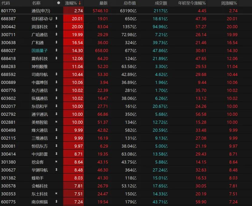 11只通信股漲停,信科移動(dòng)-U、潤澤科技、廣哈通信“20cm”漲停。