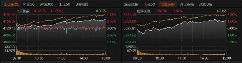 A股量?jī)r(jià)齊升,成交額較上一交易日放大近5000億元,暴增至3.65萬億元。指數(shù)全線飄紅:滬指收漲1.09%報(bào)4165.29點(diǎn),創(chuàng)業(yè)板指收漲1.82%報(bào)3388.34點(diǎn),深證成指收漲1.75%。滬深300、上證50微紅,科創(chuàng)50收漲2.43%,北證50漲逾5%。