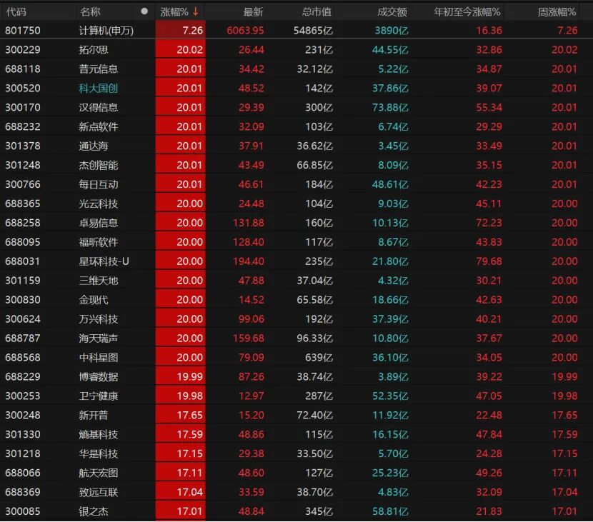 31只計(jì)算機(jī)個(gè)股漲停,拓爾思、普元信息、科大國創(chuàng)、漢得信息、新點(diǎn)軟件、通達(dá)海、杰創(chuàng)智能、每日互動(dòng)、光云科技、卓易信息、福昕軟件、星環(huán)科技-U、三維天地、金現(xiàn)代、萬興科技、海天瑞聲、博睿數(shù)據(jù)、衛(wèi)寧健康19只個(gè)股更是“20cm”漲停。