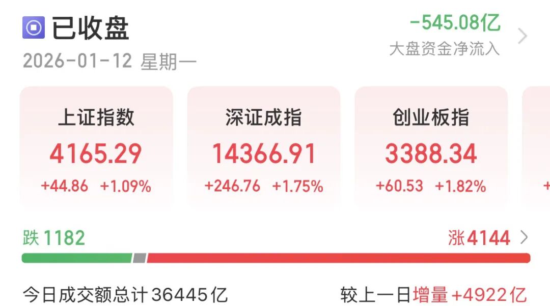 1月12日,A股成交爆量,日成交額飆至3.65萬億元,逾4000只個(gè)股收紅,201只漲停;傳媒、計(jì)算機(jī)、軍工、機(jī)械板塊掀起漲停潮,多只衛(wèi)星ETF封板。