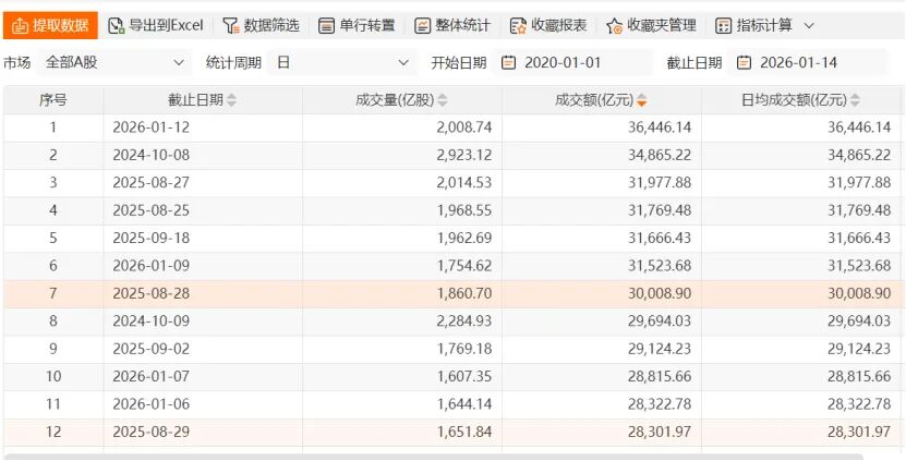 Choice數(shù)據(jù)顯示,2020年以來,A股日成交額僅有7個(gè)交易日超過3萬億元。其中,2024年10月8日,日成交額為3.49萬億元;2025年雖有4個(gè)交易日的成交額超過3萬億元,但均不超過3.2萬億元。