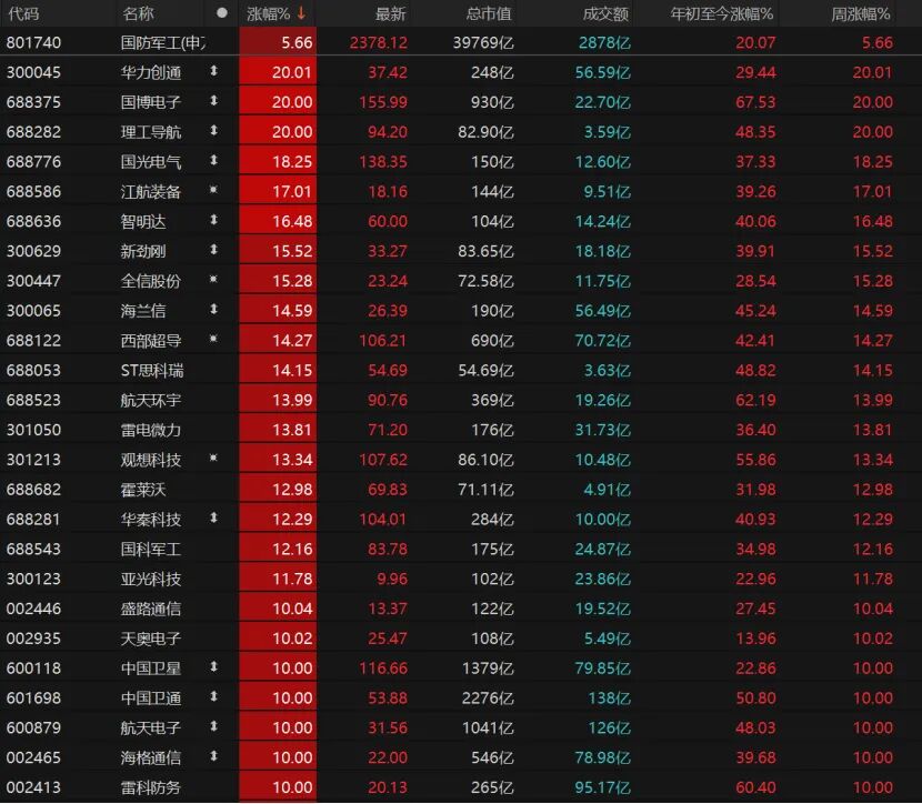 14只國防軍工個(gè)股漲停,華力創(chuàng)通、國博電子、理工導(dǎo)航“20cm”漲停,盛路通信、天奧電子、中國衛(wèi)星、中國衛(wèi)通、航天電子、海格通信、雷科防務(wù)、北斗星通均漲停。