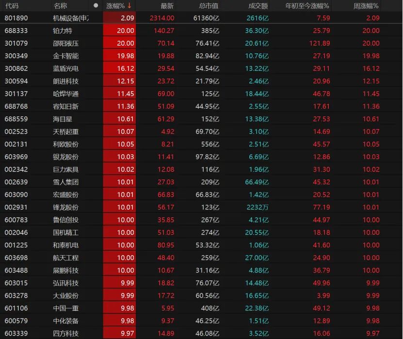 21只機(jī)械設(shè)備個(gè)股漲停,鉑力特、邵陽液壓、金卡智能“20cm”漲停,利歐股份、銀龍股份、巨力索具、雪人集團(tuán)、宏盛股份、鋒龍股份也漲停。