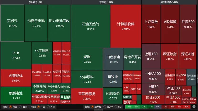 盤面上,計(jì)算機(jī)軟件、營銷服務(wù)、AI智能體、智譜AI、衛(wèi)星應(yīng)用等板塊大漲,但PCB、麒麟電池、動(dòng)力電池回收、石油天然氣、煤炭、化學(xué)原料均走弱。