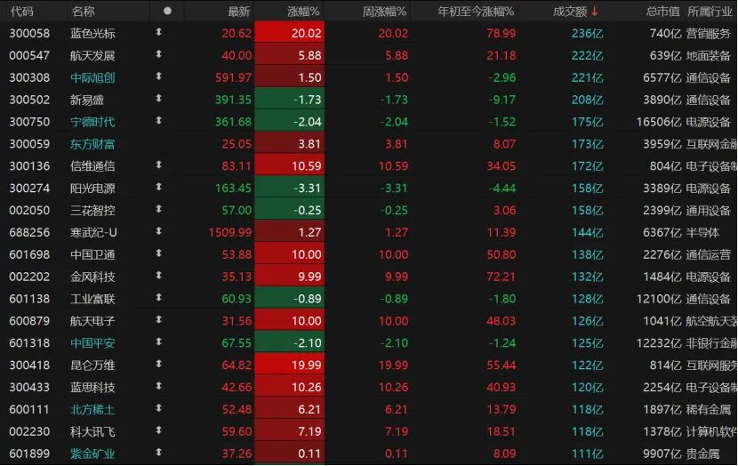 市場(chǎng)賺錢效應(yīng)不錯(cuò),共計(jì)4144只個(gè)股上漲,201只個(gè)股漲停;1182只個(gè)股收跌,跌停股9只。其中,27只個(gè)股日成交額超過100億元,多數(shù)大漲,例如藍(lán)色光標(biāo)、中國衛(wèi)通、金風(fēng)科技、航天電子、昆侖萬維等漲停。新易盛跌近2%,寧德時(shí)代、中國平安等跌逾2%。