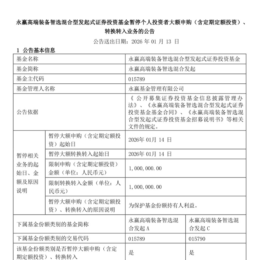 上證報(bào)中國(guó)證券網(wǎng)訊(記者王彭)1月13日,永贏基金發(fā)布公告,對(duì)旗下永贏高端裝備智選混合、永贏信息產(chǎn)業(yè)智選混合兩只基金進(jìn)行限購(gòu)。根據(jù)公告,為保護(hù)持有人利益,自1月14日起,上述兩只基金單日單賬戶(hù)申購(gòu)上限為人民幣100萬(wàn)元。