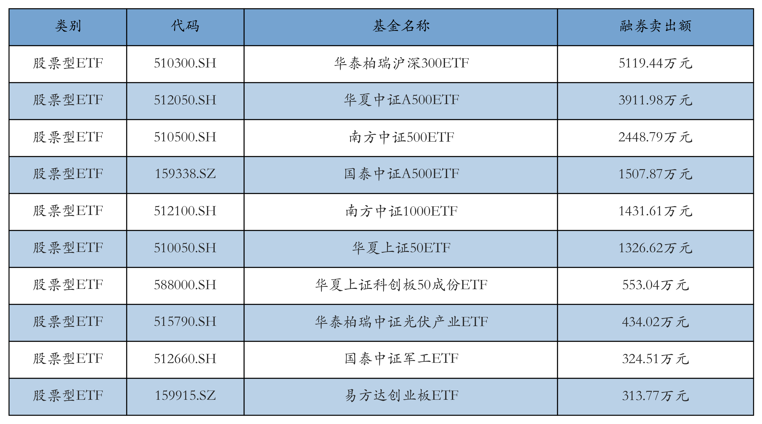 昨日股票型ETF融資賣出額最高的3只ETF及其賣出金額分別為:華泰柏瑞滬深300ETF(5119.44萬元)、華夏中證A500ETF(3911.98萬元)、南方中證500ETF(2448.79萬元)。融券賣出額前10詳情見下表: