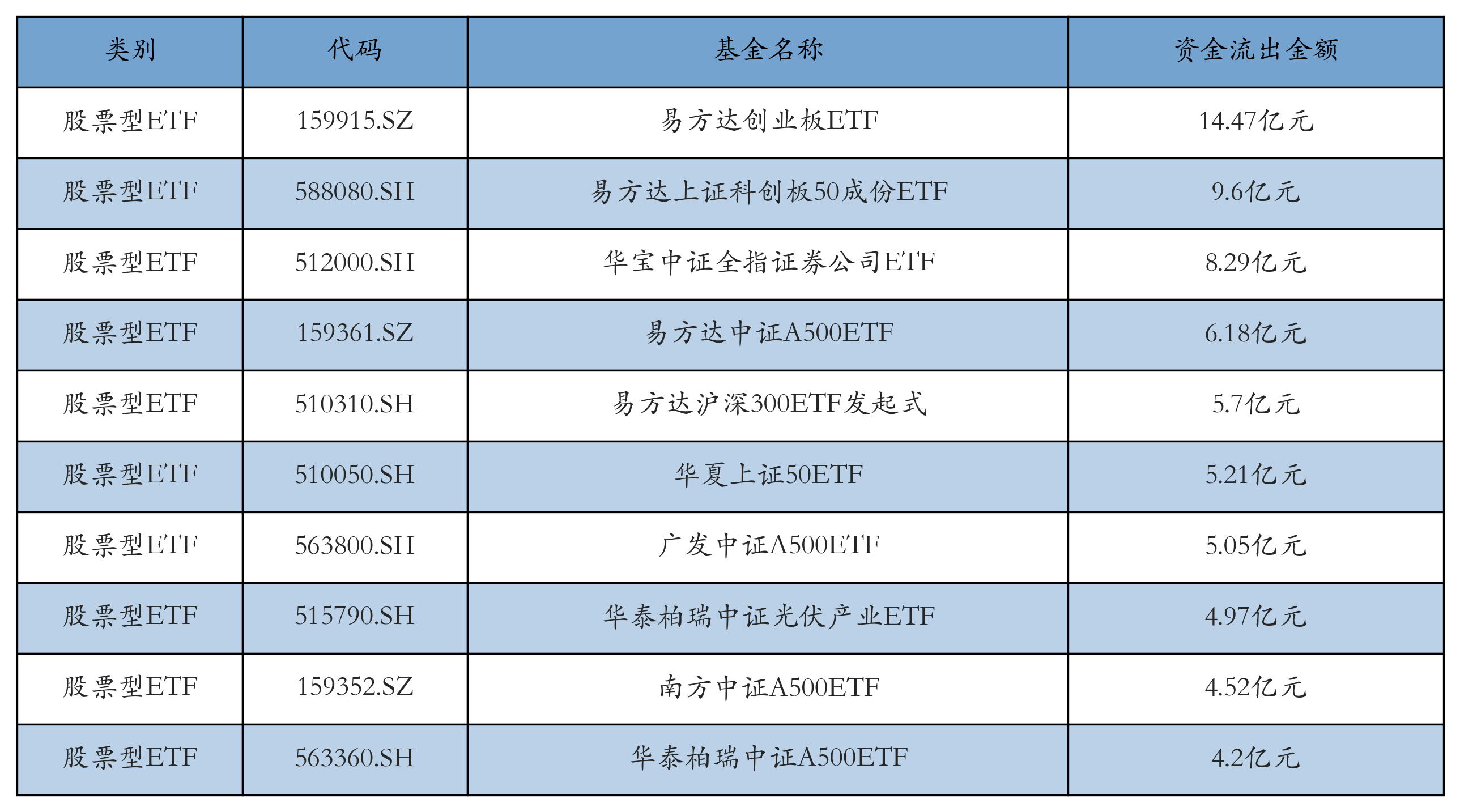 昨日股票型ETF資金流出最多的3只ETF及其流出金額分別為:易方達創(chuàng)業(yè)板ETF(流出14.47億元)、易方達上證科創(chuàng)板50成份ETF(流出9.6億元)、華寶中證全指證券公司ETF(流出8.29億元)。資金流出前10詳情見下表:
