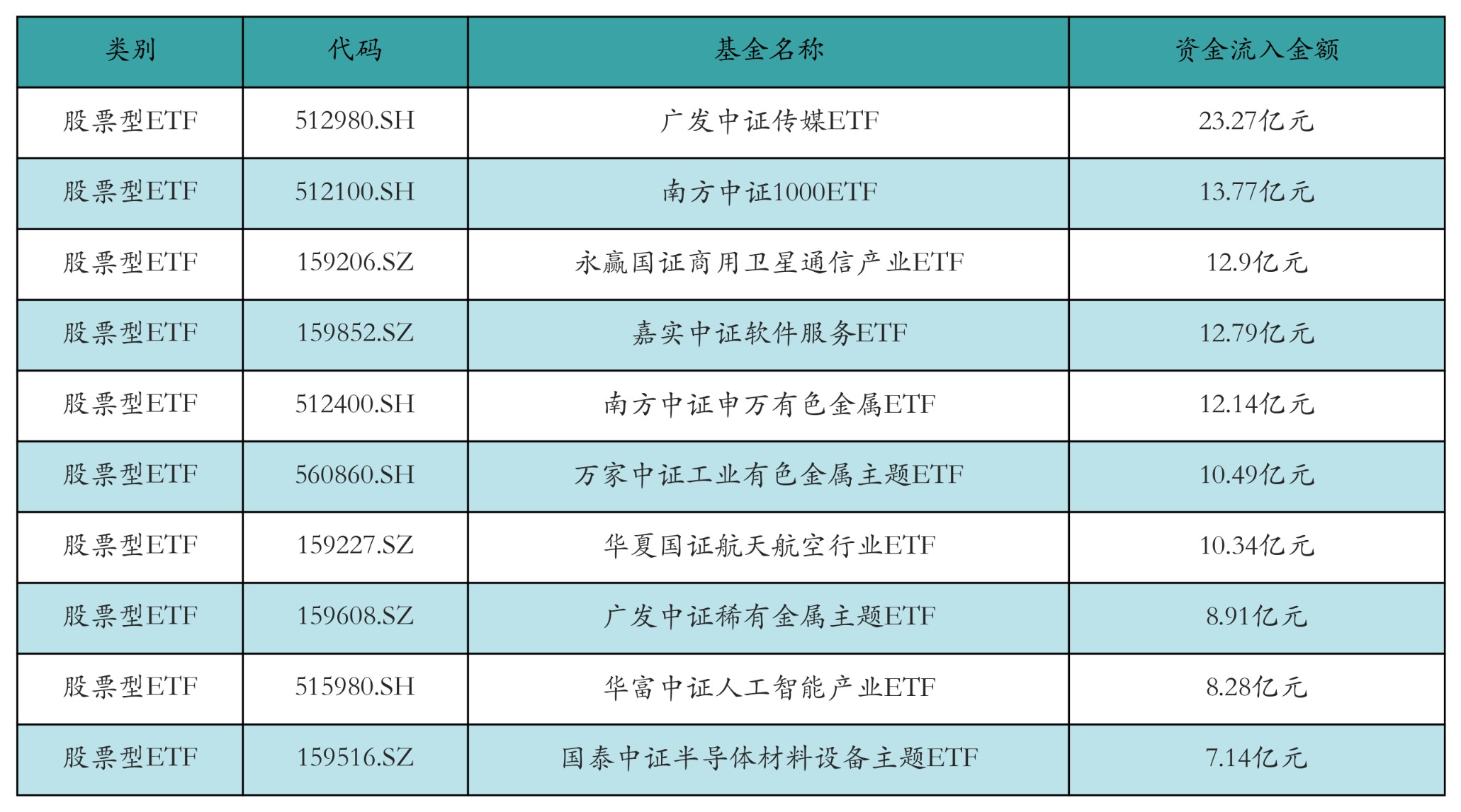 昨日股票型ETF資金流入最多的3只ETF及其流入金額分別為:廣發(fā)中證傳媒ETF(流入23.27億元)、南方中證1000ETF(流入13.77億元)、永贏國證商用衛(wèi)星通信產(chǎn)業(yè)ETF(流入12.9億元)。資金流入前10詳情見下表: