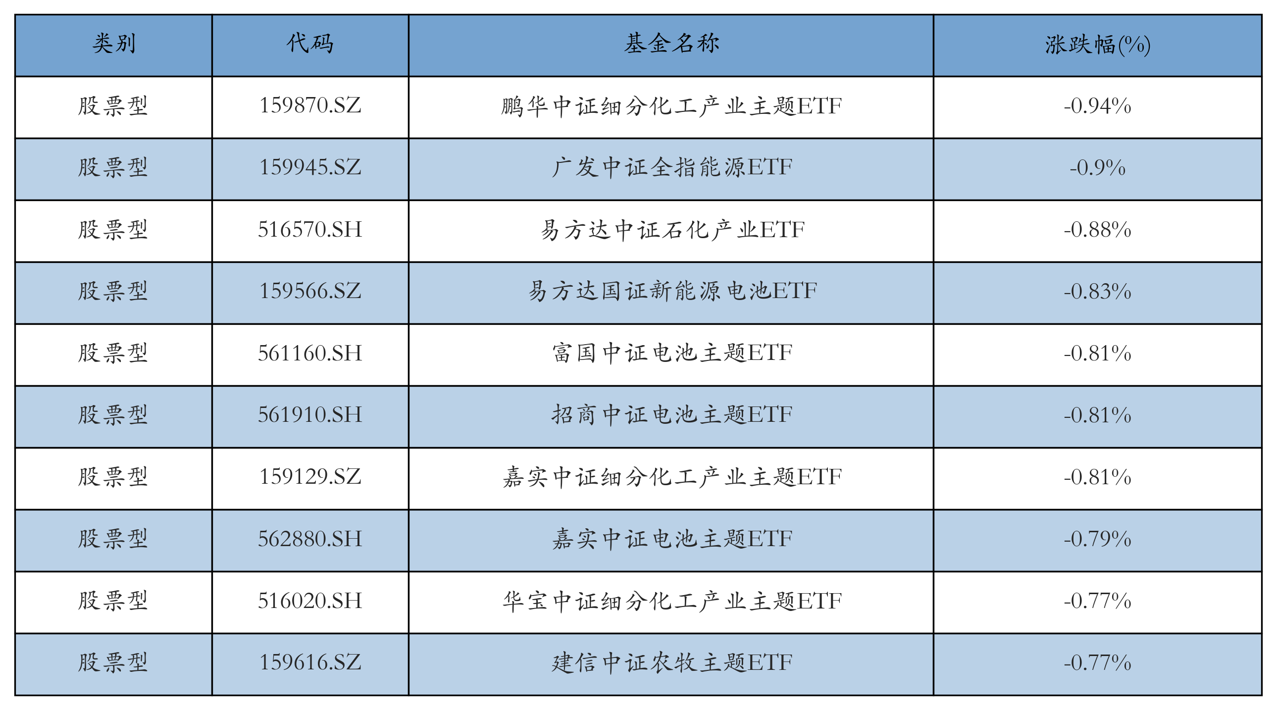 昨日股票型ETF跌幅最大的3只ETF及其收益率分別為:鵬華中證細分化工產(chǎn)業(yè)主題ETF(-0.94%)、廣發(fā)中證全指能源ETF(-0.9%)、易方達中證石化產(chǎn)業(yè)ETF(-0.88%)。跌幅前10詳情見下表: