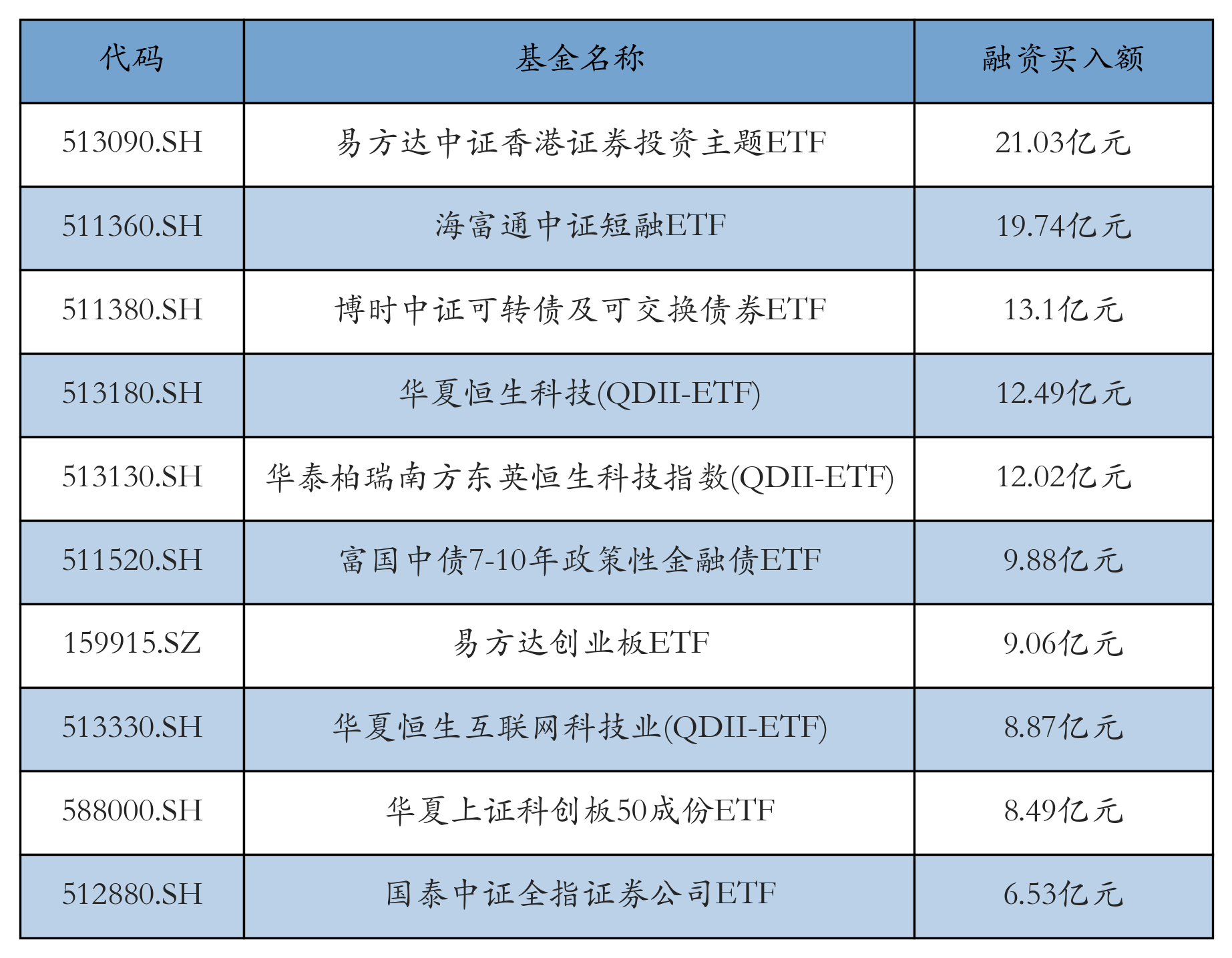 1月12日ETF融資買入額前三位分別為:易方達中證香港證券投資主題ETF(21.03億元)、海富通中證短融ETF(19.74億元)和博時中證可轉(zhuǎn)債及可交換債券ETF(13.1億元),前10具體見下表: