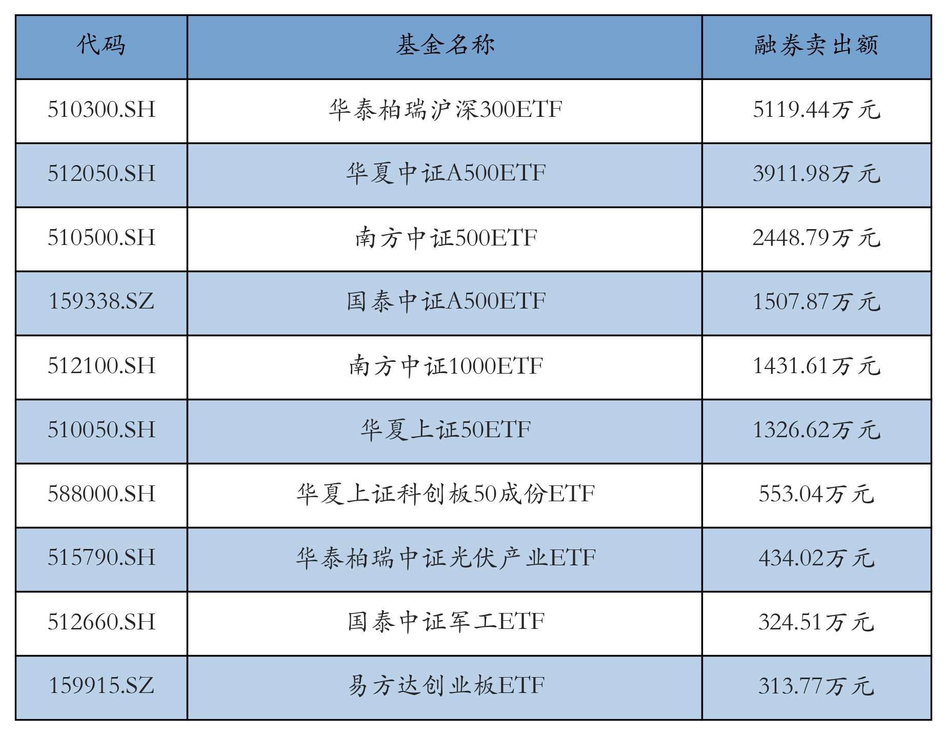 1月12日ETF融券賣出額前三位分別為:華泰柏瑞滬深300ETF(5119.44萬元)、華夏中證A500ETF(3911.98萬元)和南方中證500ETF(2448.79萬元),前10具體見下表: