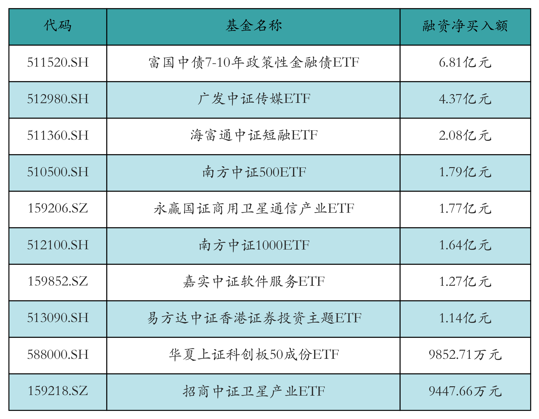 1月12日ETF融資凈買入額前三位分別為:富國中債7-10年政策性金融債ETF(6.81億元)、廣發(fā)中證傳媒ETF(4.37億元)和海富通中證短融ETF(2.08億元),前10具體見下表: