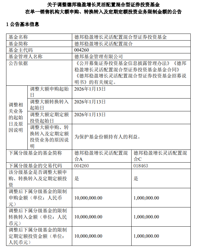 公告表示,為保護(hù)基金份額持有人的利益,德邦基金決定自2026年1月13日起,對(duì)德邦穩(wěn)盈增長(zhǎng)靈活配置混合基金在單一銷售機(jī)構(gòu)的大額申購(gòu)(含轉(zhuǎn)換轉(zhuǎn)入及定期定額投資)業(yè)務(wù)限額進(jìn)行調(diào)整。調(diào)整期間,如單日單個(gè)基金賬戶通過(guò)單一銷售機(jī)構(gòu)單筆或多筆累計(jì)申購(gòu)(含轉(zhuǎn)換轉(zhuǎn)入及定期定額投資)該基金A類基金份額金額合計(jì)超過(guò)1000萬(wàn)元、或單日單個(gè)基金賬戶通過(guò)單一銷售機(jī)構(gòu)單筆或多筆累計(jì)申購(gòu)(含轉(zhuǎn)換轉(zhuǎn)入及定期定額投資)該基金C類基金份額金額合計(jì)超過(guò)100萬(wàn)元,基金管理人有權(quán)拒絕,但基金管理人認(rèn)為相關(guān)申請(qǐng)不會(huì)影響基金平穩(wěn)運(yùn)作的除外。