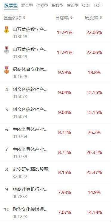 21財(cái)經(jīng)1月13日電,根據(jù)南財(cái)基金通數(shù)據(jù):2026年01月12日當(dāng)日收益靠前的股票型基金包括:申萬(wàn)菱信數(shù)字產(chǎn)業(yè)股票型發(fā)起式證券投資基金(018048,日收益11.91%);招商體育文化休閑股票型證券投資基金(001628,日收益9.59%);創(chuàng)金合信軟件產(chǎn)業(yè)股票型發(fā)起式證券投資基金(016073,日收益9.04%)等。收益較低的股票型基金包括:國(guó)聯(lián)安科技動(dòng)力股票型證券投資基金(001956,日收益-2.13%);農(nóng)銀匯理醫(yī)療保健主題股票型證券投資基金(000913,日收益-2.02%);紅土創(chuàng)新醫(yī)療保健股票型發(fā)起式證券投資基金(010434,日收益-1.66%)等。