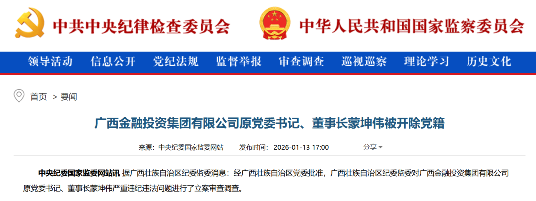 1月13日,中央紀委國家監(jiān)委官網(wǎng)通報:廣西金融投資集團有限公司原黨委書記、董事長蒙坤偉被開除黨籍。
