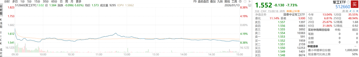 1月13日,軍工ETF(512660)遭遇大幅調(diào)整,收盤下跌7.73%,成交額達(dá)14.50億元,創(chuàng)下近期較大跌幅。