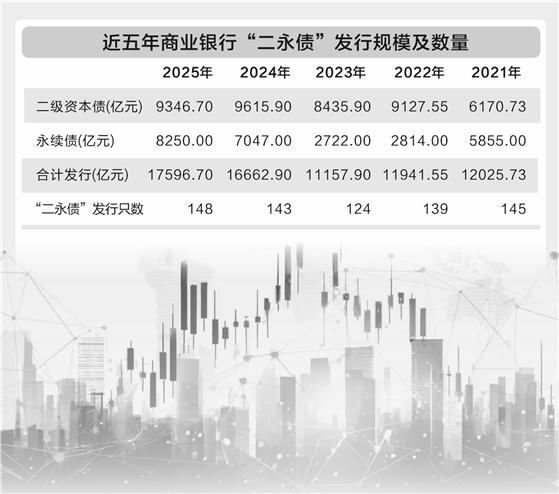 從去年開(kāi)始,商業(yè)銀行明顯加快了資本補(bǔ)充節(jié)奏。除了增資擴(kuò)股,銀行還通過(guò)發(fā)行二級(jí)資本債、永續(xù)債(下稱(chēng)“二永債”)等方式補(bǔ)充資本金。數(shù)據(jù)顯示,2025年銀行發(fā)行“二永債”規(guī)模達(dá)1.76萬(wàn)億元,創(chuàng)出歷史新高。