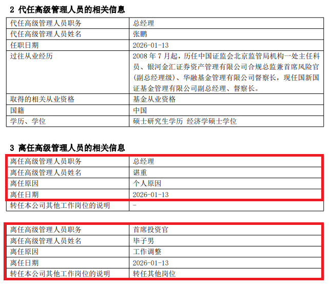 1月14日,國新國證基金公告,總經(jīng)理諶重因個人原因離職,總經(jīng)理職位由公司副總經(jīng)理、督察長張鵬代任。同時,公司首席投資官畢子男因工作調(diào)整轉(zhuǎn)任其他崗位。