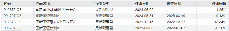 他自2024年6月5日起任國新國證融澤6個月定開基金經(jīng)理,截至1月13日,任職期回報為4.26%。截至2025年三季度末,他管理的公募基金規(guī)模不足1億元。