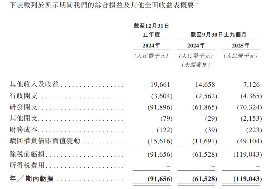 財務數(shù)據(jù)顯示,2024年度公司凈虧損9165.6萬元,2025年前三季度凈虧損進一步擴大至1.19億元,主要由于研發(fā)開支及贖回權負債賬面值變動所致。現(xiàn)金流方面,經(jīng)營活動現(xiàn)金凈流出持續(xù)擴大,2024年為7886.5萬元,2025年前三季度增至8407.5萬元,資金主要用于研發(fā)及行政活動。