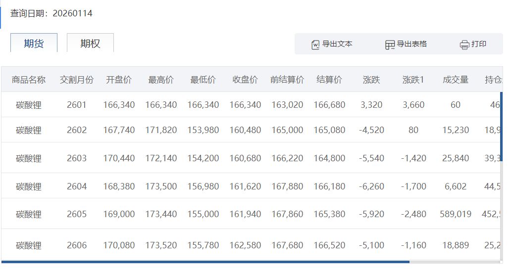 1月14日,碳酸鋰期貨價(jià)格在創(chuàng)下兩年來(lái)新高后出現(xiàn)回調(diào)。截至下午收盤(pán),主力合約lc2605報(bào)收16.19萬(wàn)元/噸,跌幅為3.53%。當(dāng)天價(jià)格最高觸及17.34萬(wàn)元/噸,成交額達(dá)974.1億元。