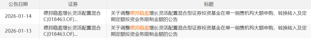 部分基金則宣布限購。德邦基金連發(fā)兩則公告,調整德邦穩(wěn)盈增長混合基金限購金額。根據公告,自1月14日起,德邦穩(wěn)盈增長混合基金在單一銷售機構大額申購A類、C類基金份額的金額上限,由原1000萬元、100萬元分別調整為10萬元、1萬元。類似的還有,1月13日,永贏基金發(fā)布公告,對旗下永贏高端裝備智選混合、永贏信息產業(yè)智選混合兩只基金進行限購。
