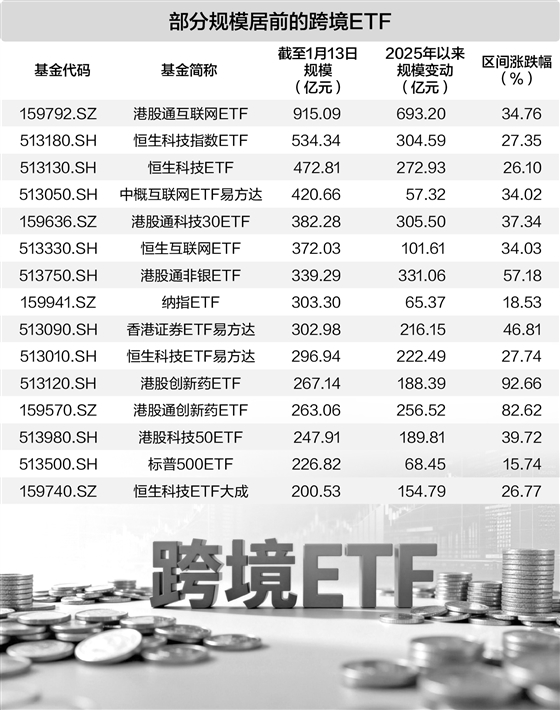 今年來看,自2026年開年以來,跨境ETF規(guī)模在不足半個(gè)月的時(shí)間里增加了600多億元,最新規(guī)模已達(dá)到10098億元。
