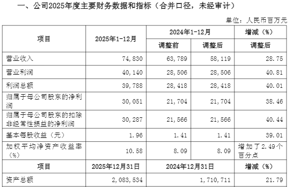 具體而言,2025年,中信證券實現(xiàn)營業(yè)收入748.30億元,同比(與前一年同期相較)增加28.75%;歸屬于母公司股東的凈利潤(下稱“凈利潤”) 300.51億元,同比增加38.46%。