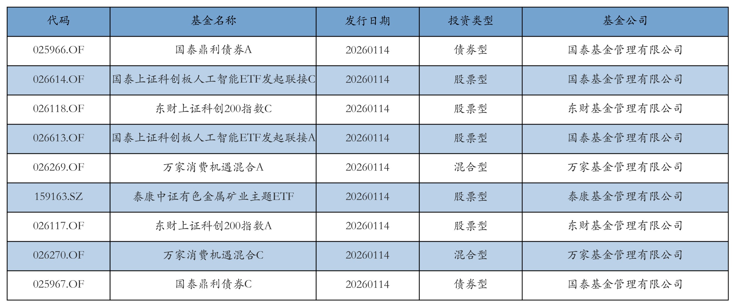 昨日有9只新基金發(fā)行,分別為:國泰鼎利債券A、國泰上證科創(chuàng)板人工智能ETF發(fā)起聯(lián)接C、東財上證科創(chuàng)200指數(shù)C、國泰上證科創(chuàng)板人工智能ETF發(fā)起聯(lián)接A、萬家消費機遇混合A、泰康中證有色金屬礦業(yè)主題ETF、東財上證科創(chuàng)200指數(shù)A、萬家消費機遇混合C、國泰鼎利債券C,詳情見下表: