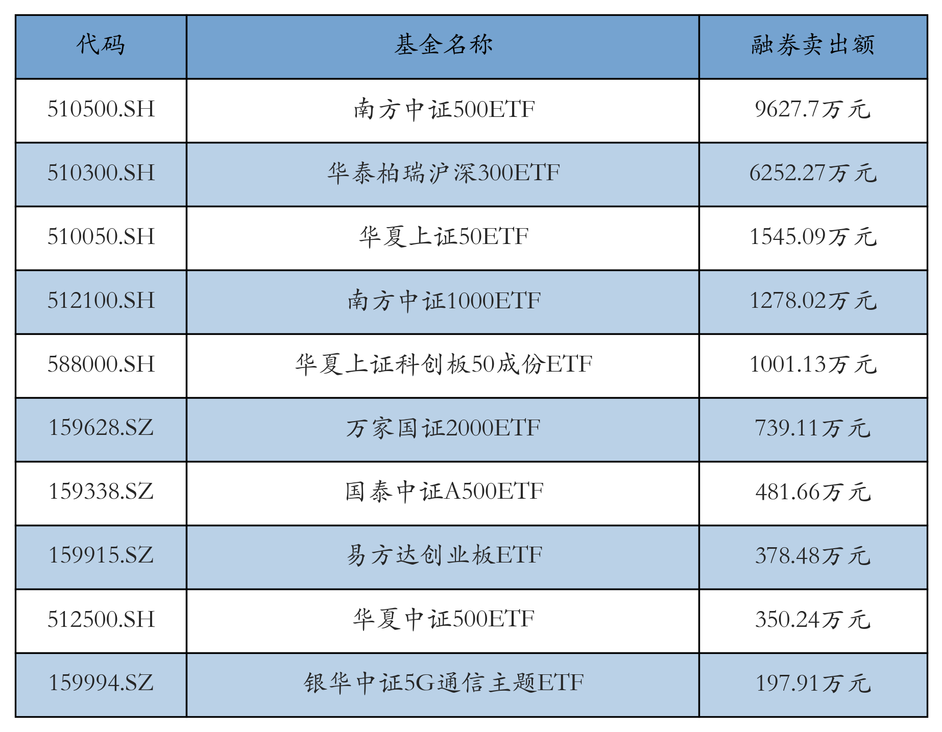 1月14日ETF融券賣出額前三位分別為:南方中證500ETF(9627.7萬元)、華泰柏瑞滬深300ETF(6252.27萬元)和華夏上證50ETF(1545.09萬元),前10具體見下表: