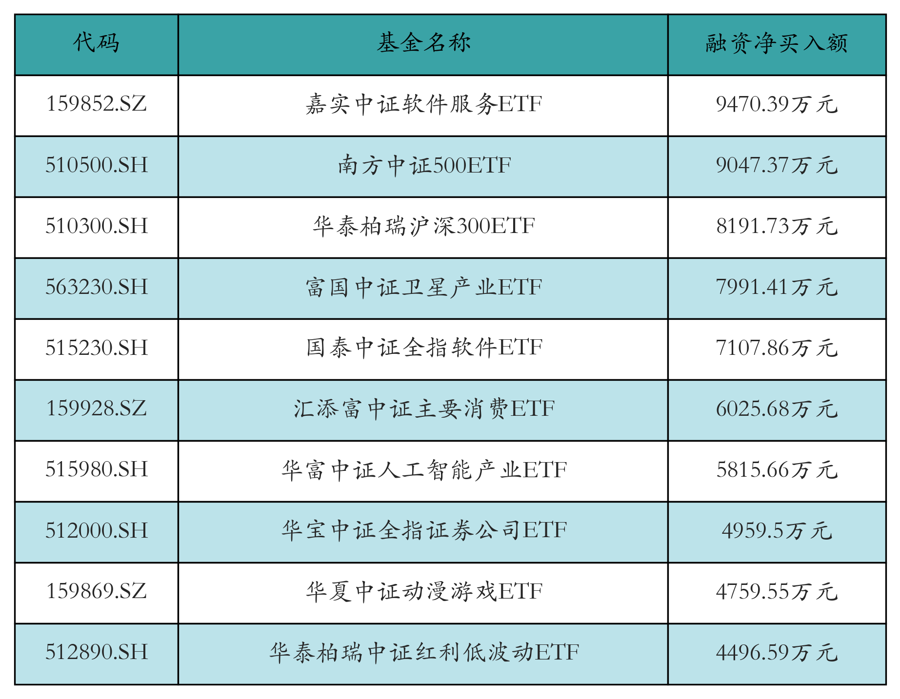 1月14日ETF融資凈買入額前三位分別為:嘉實(shí)中證軟件服務(wù)ETF(9470.39萬元)、南方中證500ETF(9047.37萬元)和華泰柏瑞滬深300ETF(8191.73萬元),前10具體見下表: