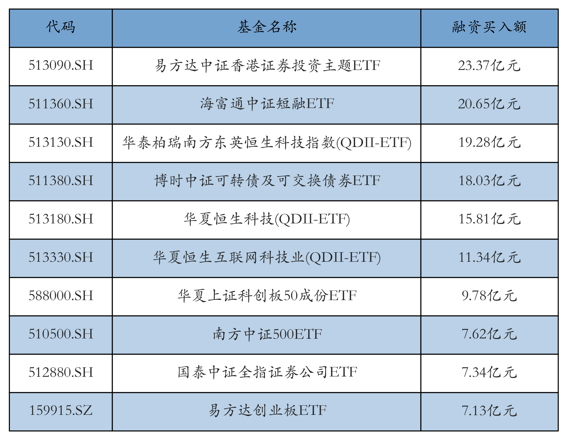 1月14日ETF融資買入額前三位分別為:易方達(dá)中證香港證券投資主題ETF(23.37億元)、海富通中證短融ETF(20.65億元)和華泰柏瑞南方東英恒生科技指數(shù)(QDII-ETF)(19.28億元),前10具體見下表: