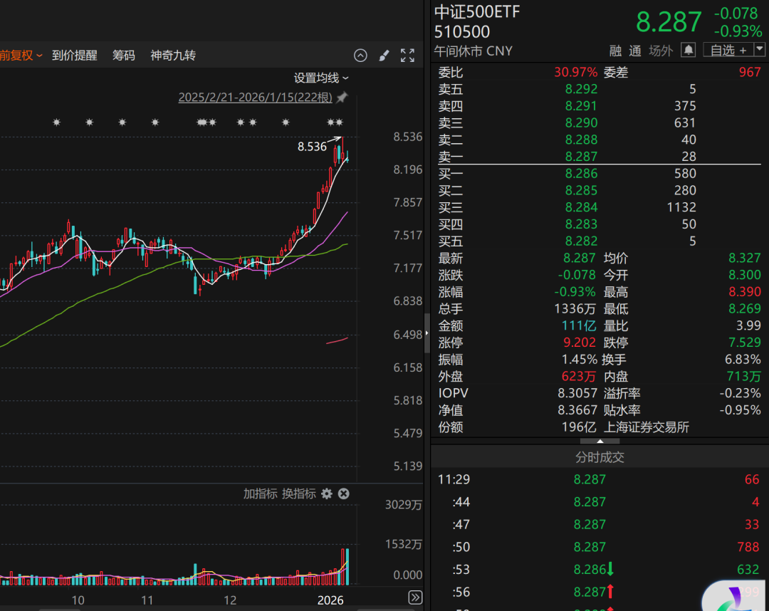 除了華泰柏瑞滬深300ETF以外,多只中證A500ETF成交量也顯著放大。華泰柏瑞中證A500ETF成交額為126億元,接近昨天全天的135億元;華夏中證A500ETF成交額為123億元,昨日成交額為146億元。此外,南方中證500ETF成交額為111億元,逼近昨天全天的113億元成交額。