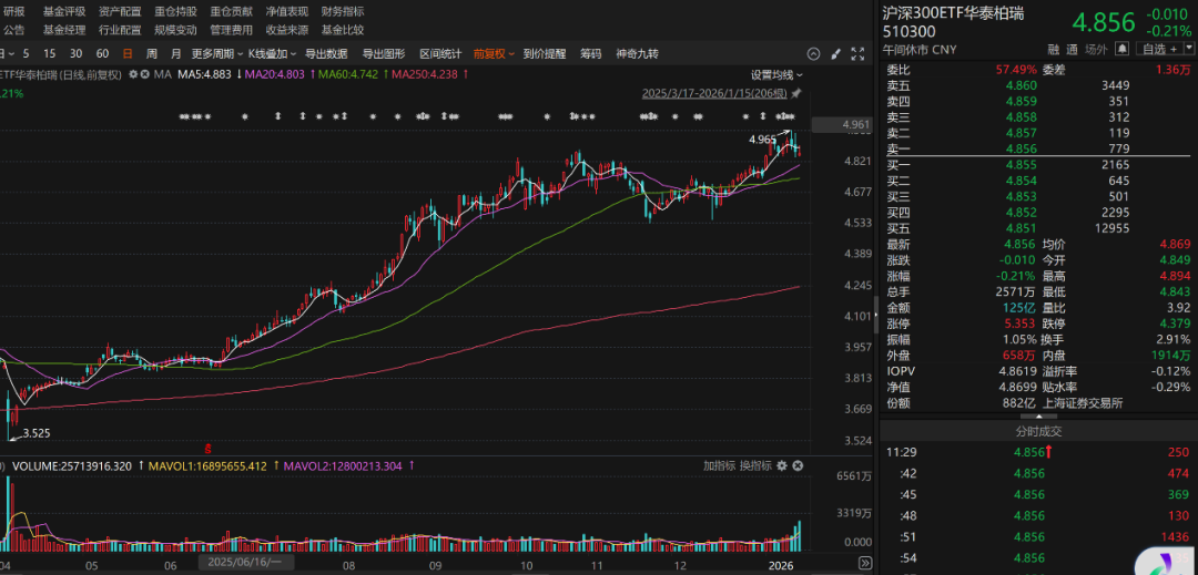 1月15日上午,多只寬基ETF成交量放大。其中,全市場規(guī)模最大的華泰柏瑞滬深300ETF半日成交125億元,超過了2025年4月9日以來的最高日成交額。