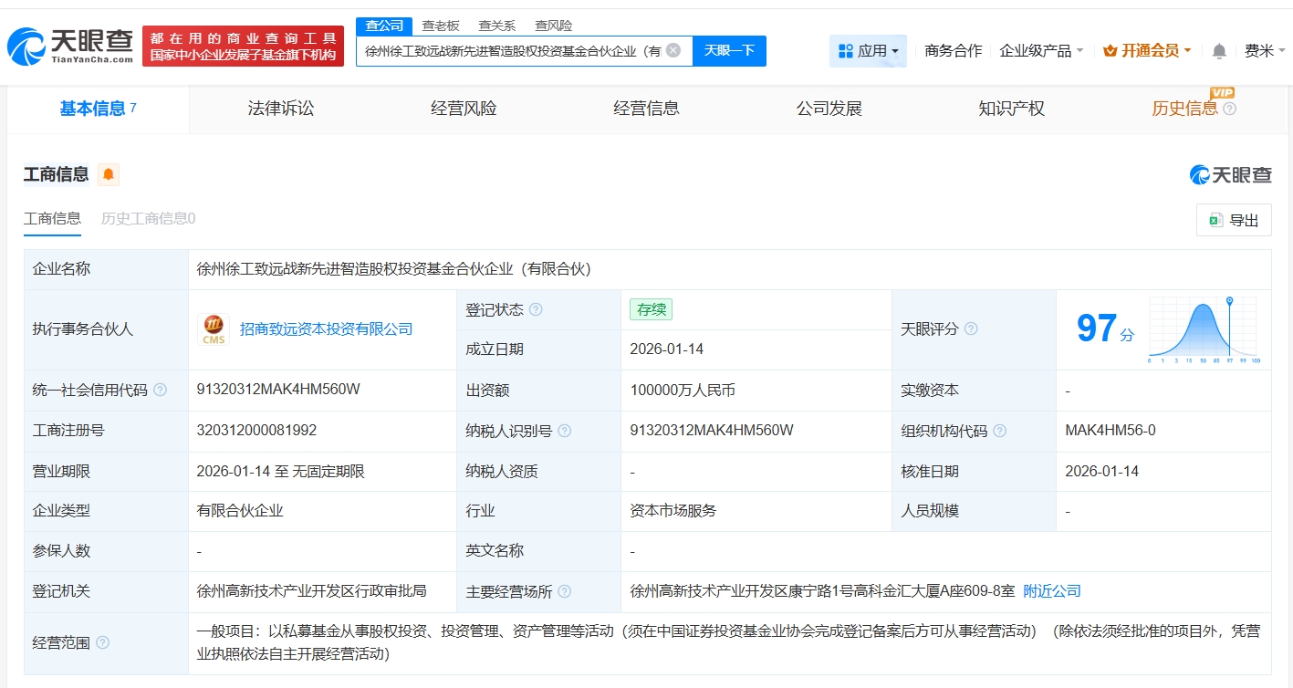 每經(jīng)AI快訊,天眼查工商信息顯示,近日,徐州徐工致遠戰(zhàn)新先進智造股權投資基金合伙企業(yè)(有限合伙)成立,執(zhí)行事務合伙人為招商致遠資本投資有限公司,出資額10億元人民幣,經(jīng)營范圍為以私募基金從事股權投資、投資管理、資產(chǎn)管理等活動。合伙人信息顯示,該基金由徐州市戰(zhàn)略性新興產(chǎn)業(yè)母基金有限公司、徐工集團產(chǎn)業(yè)投資發(fā)展(徐州)有限公司、招商證券(600999)旗下招商致遠資本投資有限公司等共同出資。