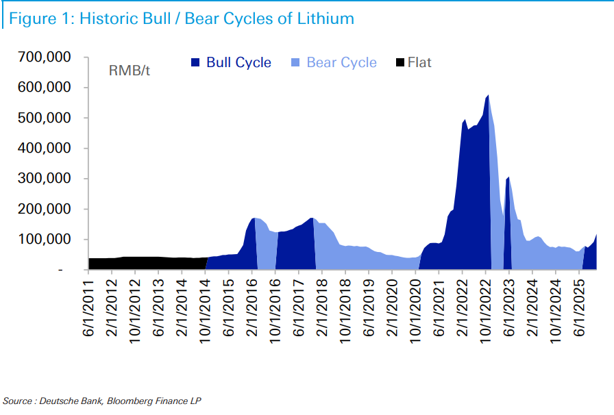 1月14日,德銀Corinne Blanchard團(tuán)隊(duì)在最新研報(bào)中指出,鋰在2025年夏季(約8月)出現(xiàn)了周期的底部。自那時(shí)起,鋰現(xiàn)貨價(jià)格已從低點(diǎn)攀升了約160%,期貨更是飆升了180%。與過(guò)去由政府補(bǔ)貼驅(qū)動(dòng)的電動(dòng)汽車(EV)狂熱和供應(yīng)鏈沖擊不同,本輪牛市的基礎(chǔ)更為堅(jiān)實(shí):它建立在一個(gè)規(guī)模擴(kuò)大了11倍的成熟市場(chǎng)之上,并由AI和數(shù)據(jù)中心對(duì)電池儲(chǔ)能系統(tǒng)(BESS)的“剛性需求”所驅(qū)動(dòng)。
