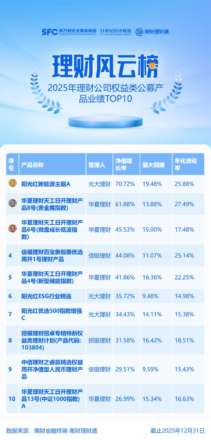 光大理財“陽光紅新能源主題A”2025年漲70.72%,位居榜單首位。行業(yè)背景看,新能源板塊2025年震蕩走強。據產品三季報顯示,該產品業(yè)績比較基準為:中證新能指數收益率×80%+中債綜合財富(總值)指數收益率×20%,其中中證新能指數2025大漲42.44%。據產品三季報顯示,資產配置上看,該產品投資的權益類資產占產品總資產比例為88.2%。前10大重倉股中(穿透后前十大資產)包含鋰電負極材料龍頭尚太科技、逆變器龍頭德業(yè)股份、新能源電池龍頭寧德時代、風電整機制造龍頭明陽智能、風電主軸龍頭金雷股份,以上個股持倉占比均超8%,其中德業(yè)股份、金雷股份、寧德時代2025年均漲超42%。