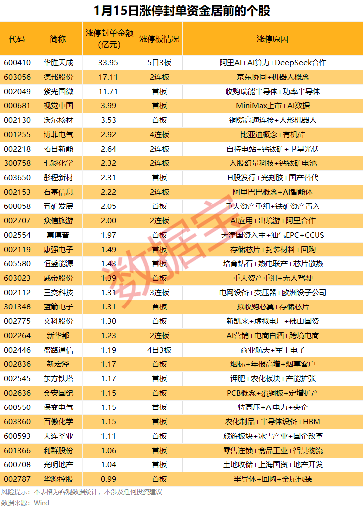 以封單金額計算,29股封單金額超1億元,其中華勝天成、德邦股份、紫光國微等漲停板封單金額居前,分別為33.95億元、17.11億元、11.71億元。