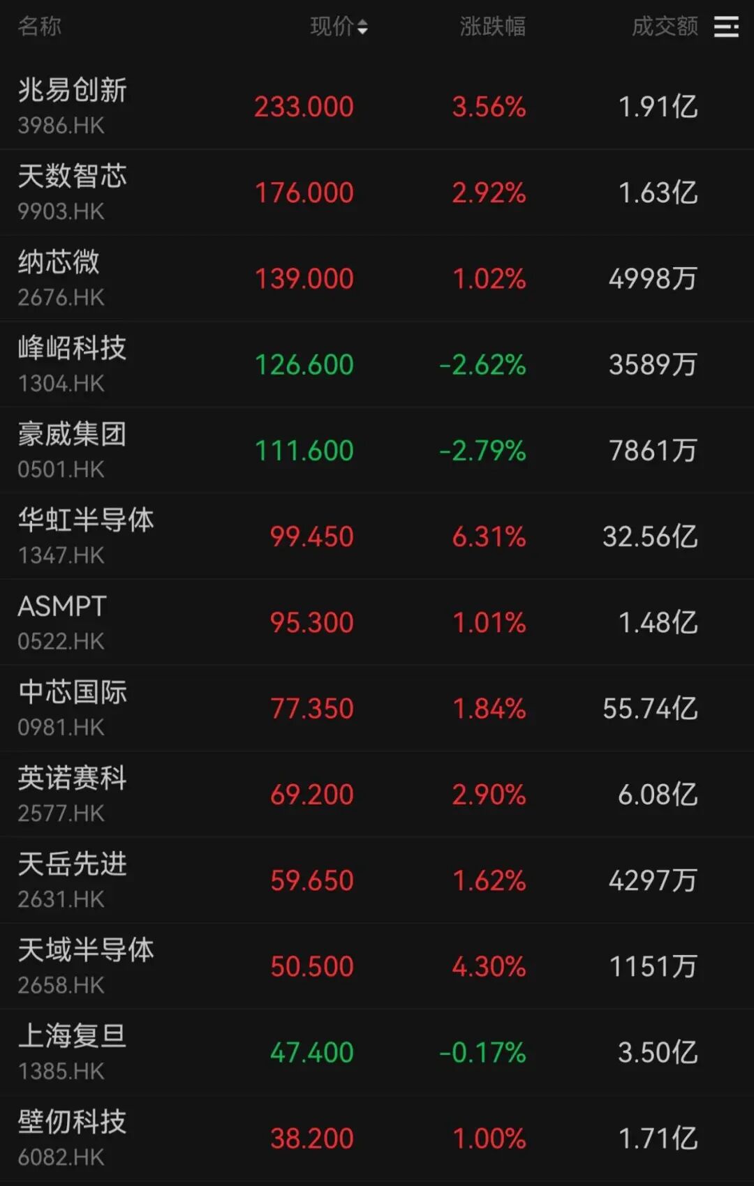 Wind香港半導(dǎo)體指數(shù)尾盤拉升,截至收盤,華虹半導(dǎo)體、兆易創(chuàng)新、中芯國(guó)際分別上漲6.31%、3.56%、1.84%。